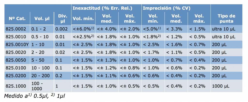 El volumen se puede ajustar con una sola mano, incluso con la otra mano ocupada. Mientras se pipetea, el mecanismo de parade por clicks y el botón giratorio smarties del émbolo aseguran la estabilidad del volumen ajustado. Existen 8 modelos que abarcan volúmenes desde 0.1 hasta 1’000µl.